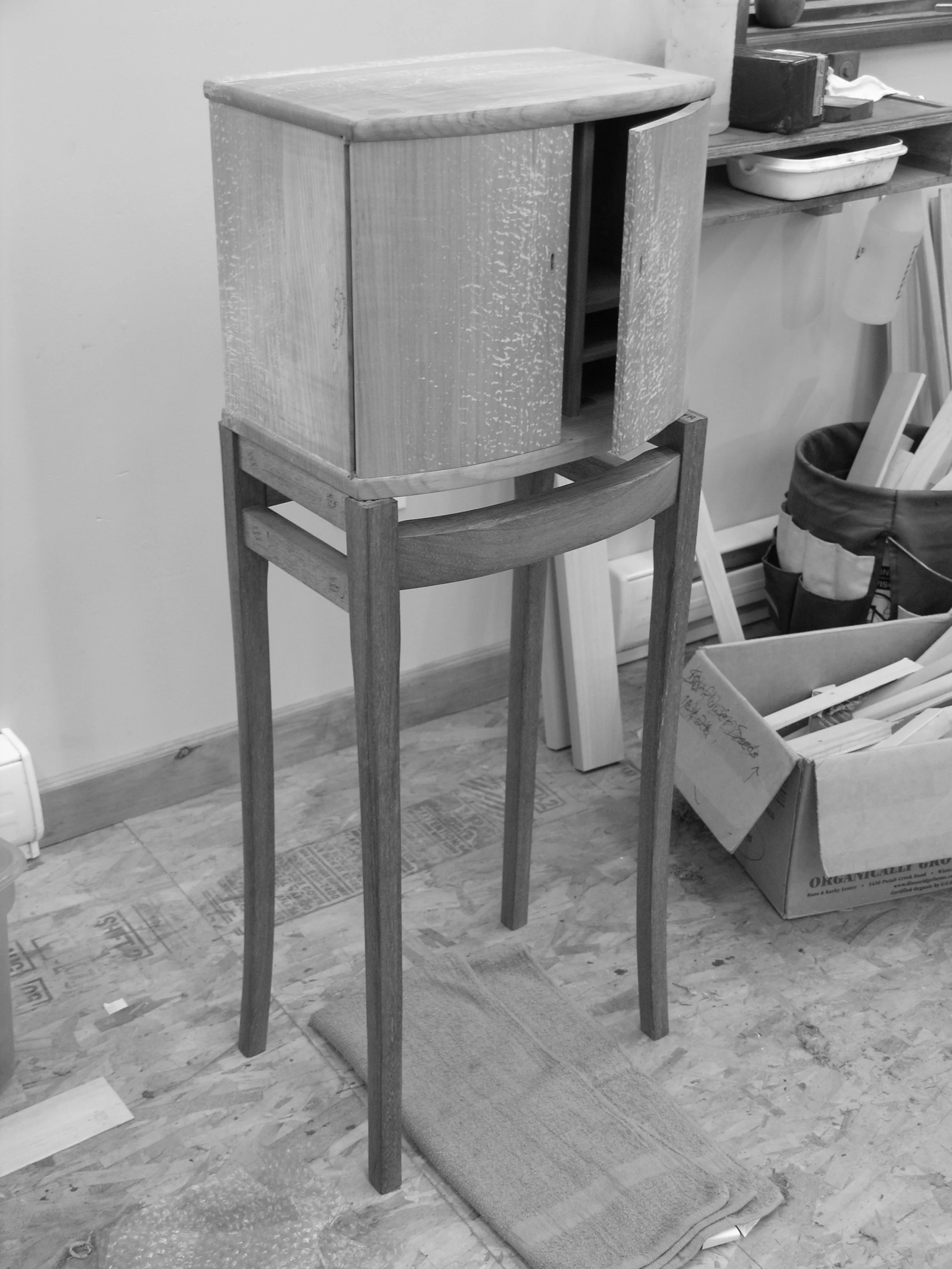 At the end of this past term, I asked John to read the same passage. This was John’s third term at the school in the past year. John arrived with very little experience in the craft, it has been a real pleasure to watch his progression as a craftsman, his focus and dedication to the craft has been an inspiration to witness. John’s lovely wife Haydee joined us for a couple of days in each of his last two terms and kept the home fires burning while John pursued his craft education. John’s fine cabinet in spalted big leaf maple on a stand of kwila is shown nearing completion.