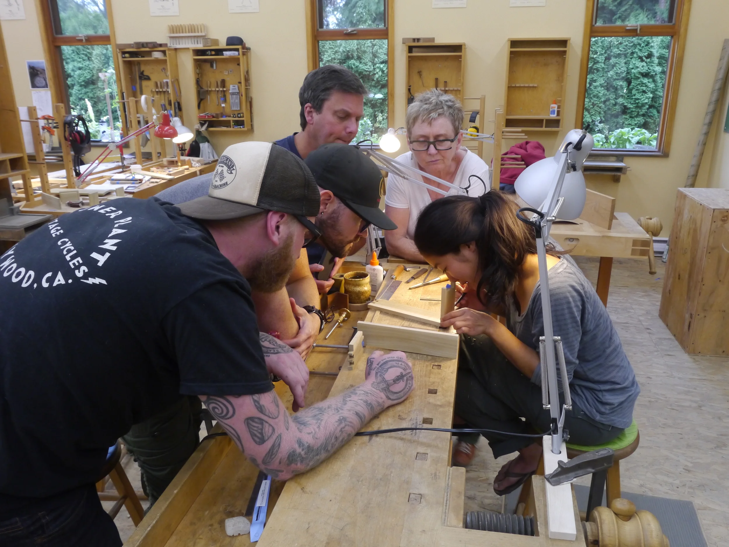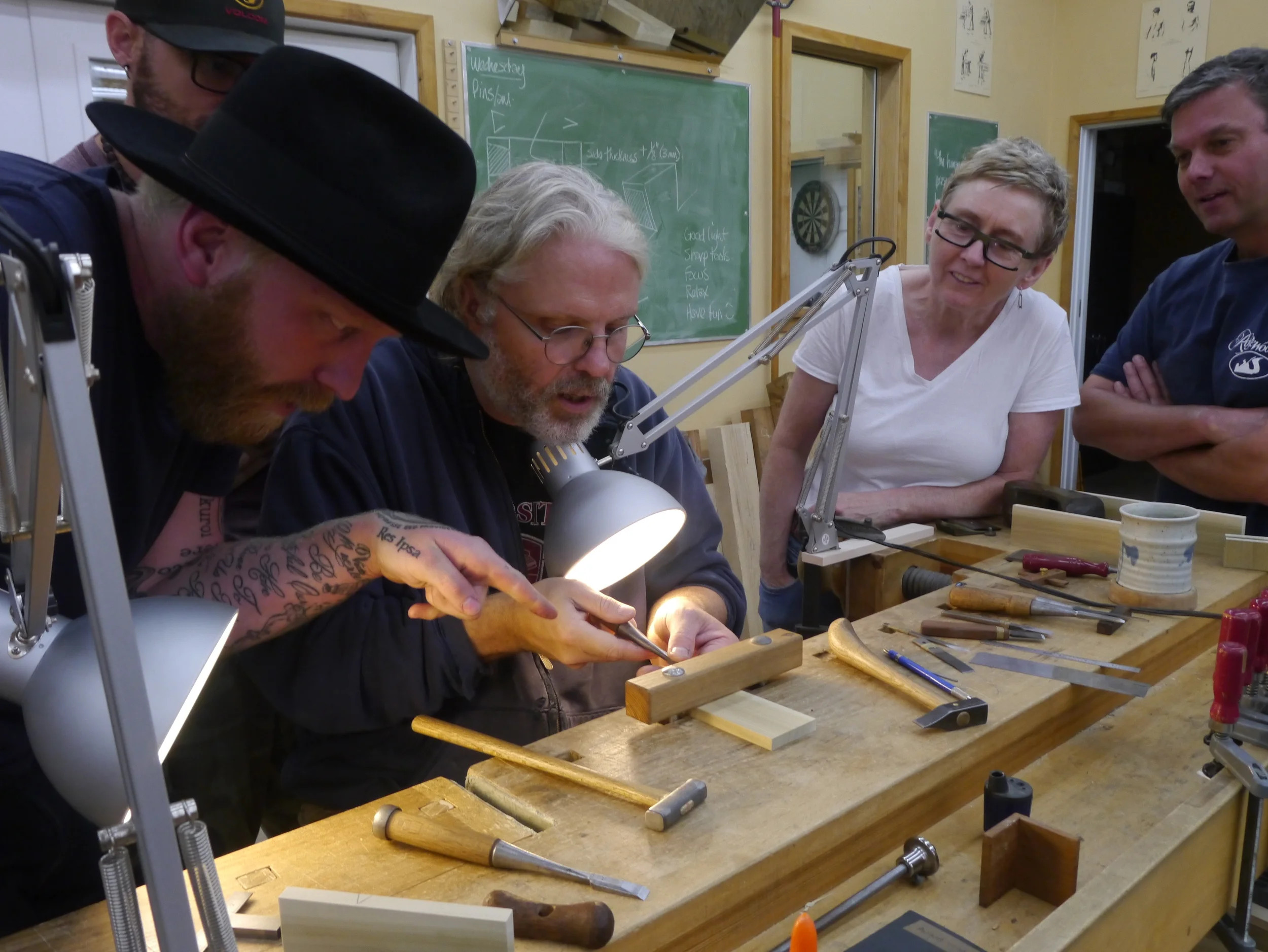 The students continued their toolmaking journeys with a set of tools specific to dovetailing. Each one made a small wooden bevel gauge for laying out dovetails, a small brass hammer, diagonal sticks, a paring chisel, and a single bevel knife. They learned to anneal hardened steel so that it can be repurposed and shaped easily, then to harden and temper it to hold an edge.